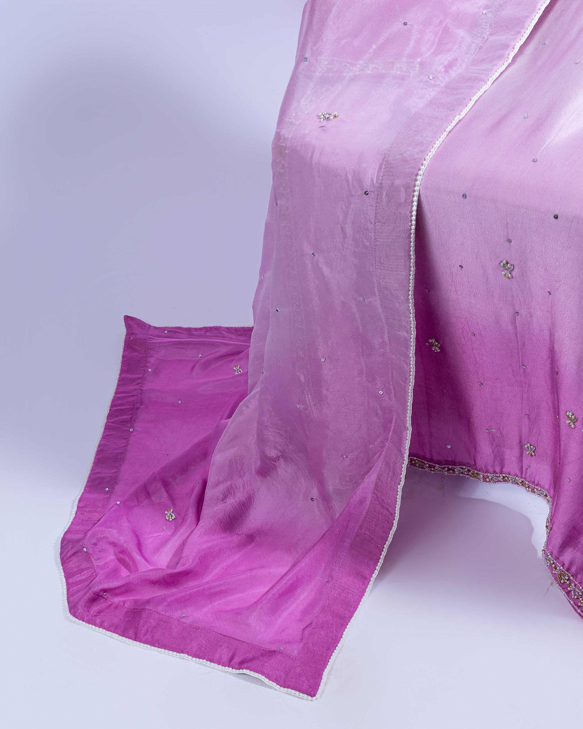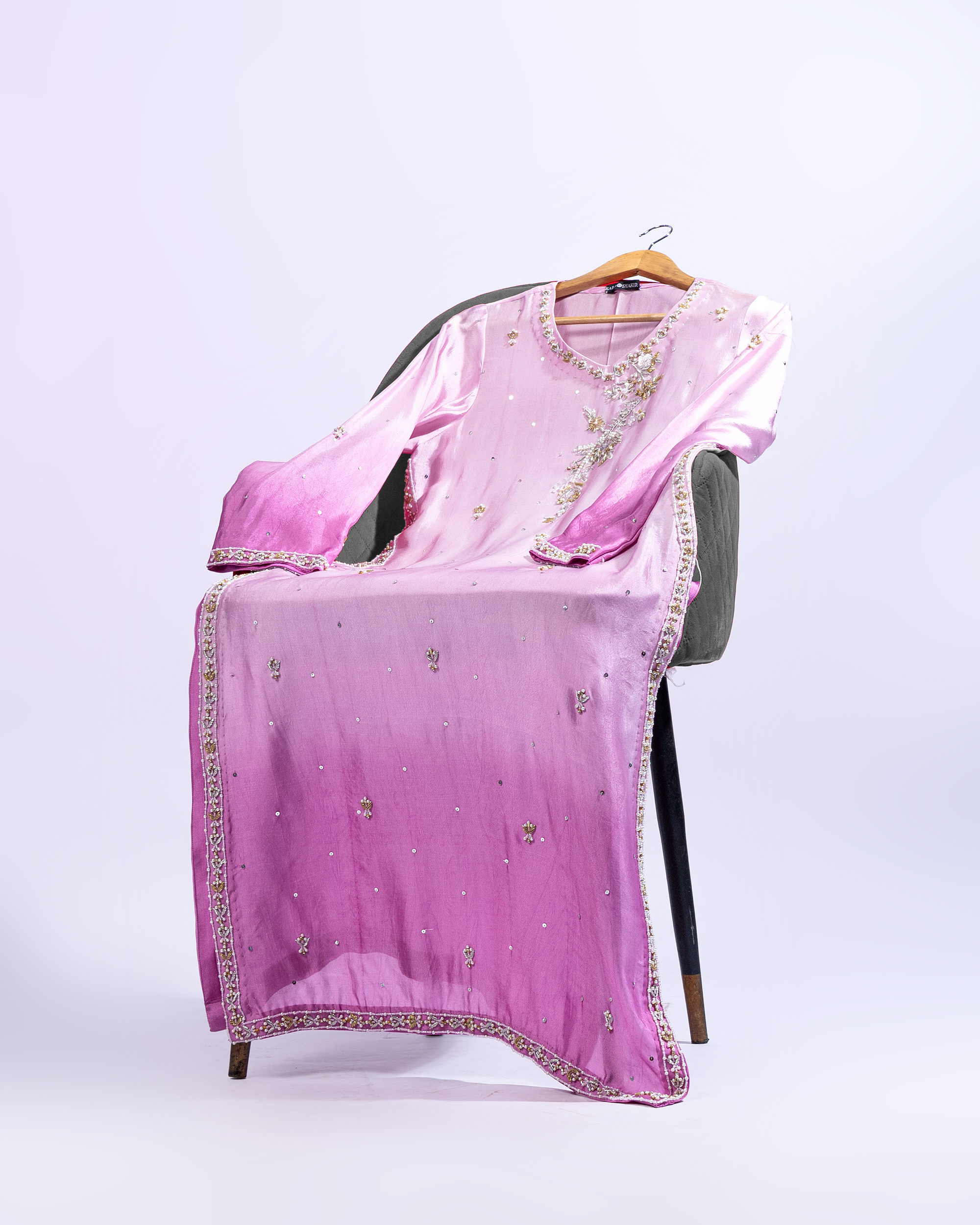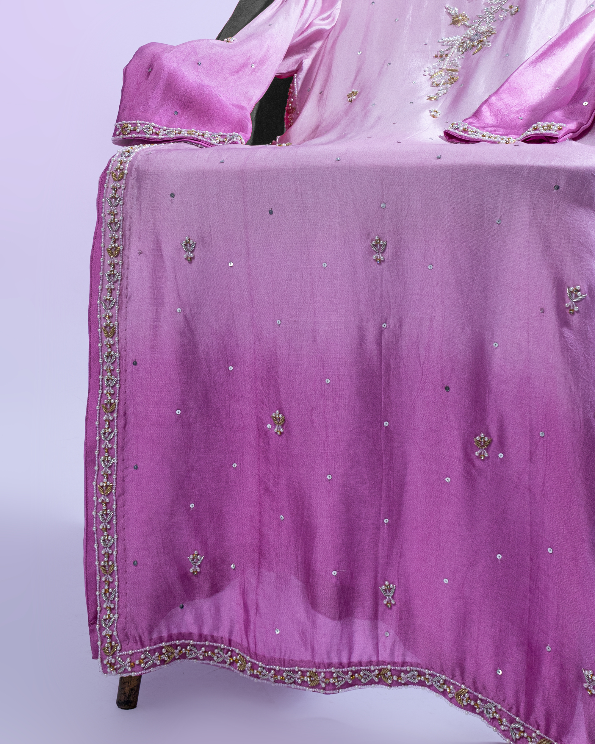 Bahisht is crafted in pure sheesha silk with a soft medium silk dupatta, offered in three exquisite ombré shades—pink, turquoise, and olive. The V-neckline and shoulder-to-daman design are beautifully embellished with silver zardozi, sequins, Swarovski, and delicate zero pearls, adding just the right touch of sparkle. The shaded fabric flows gracefully in color, making this ensemble elegant, versatile, and timeless.