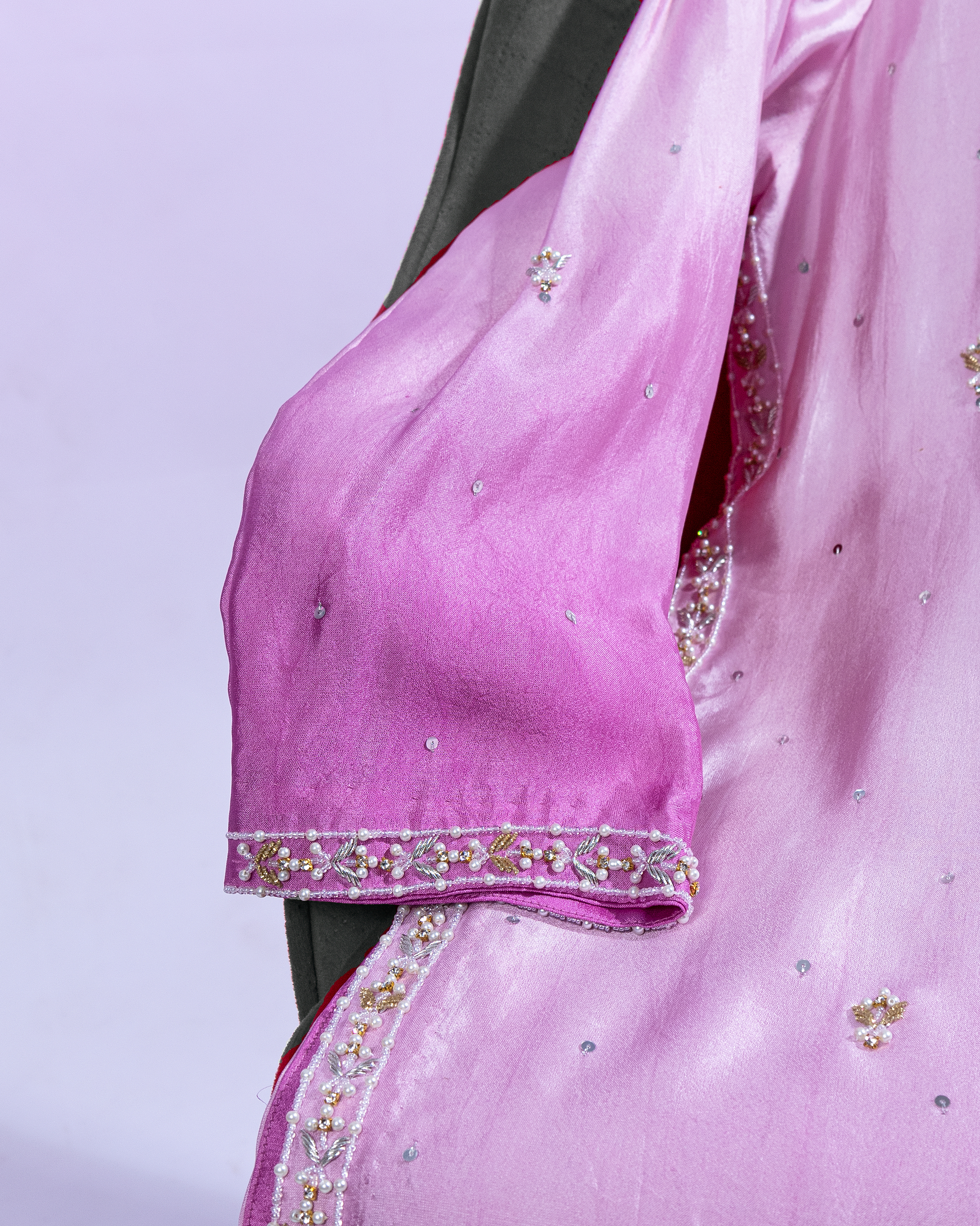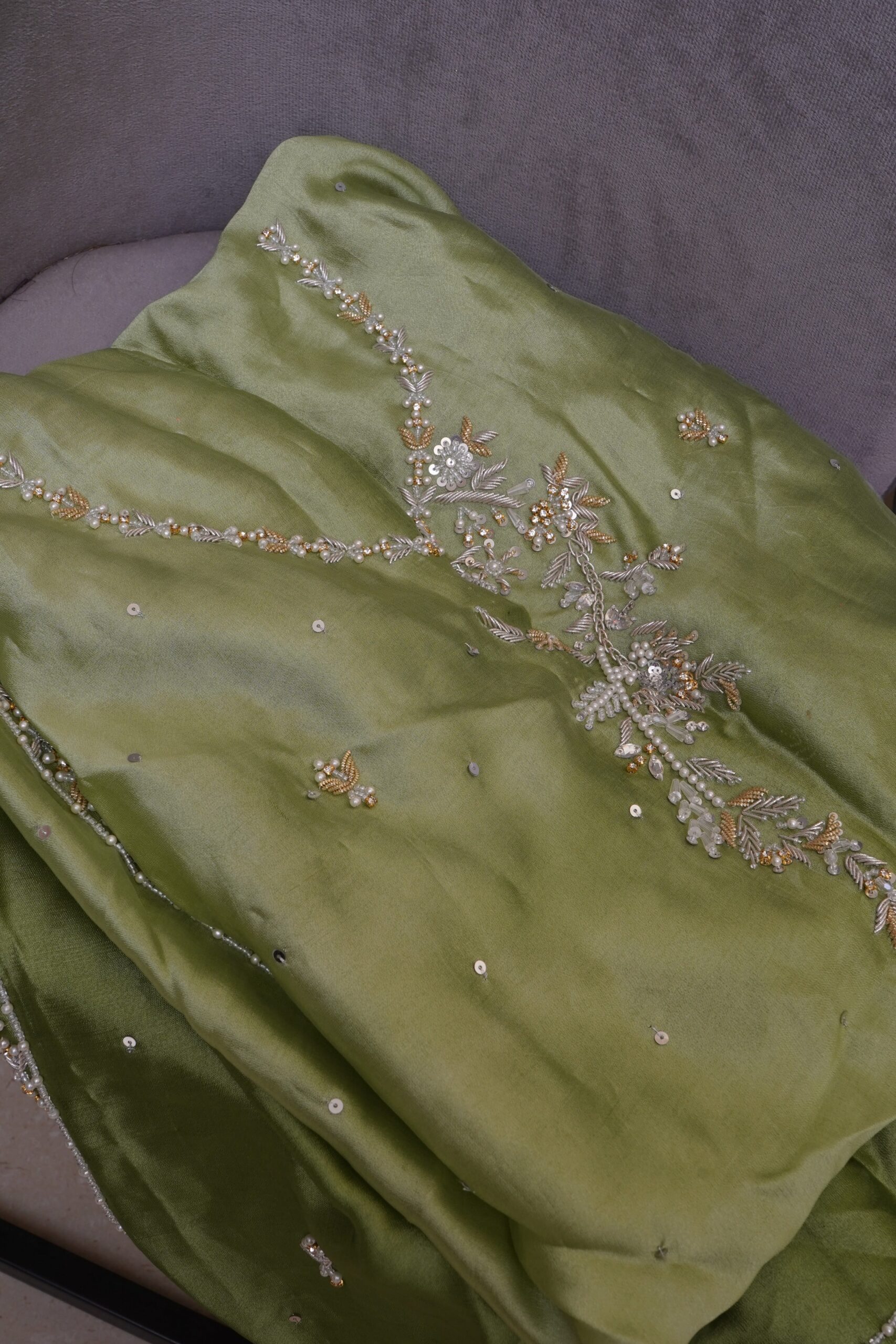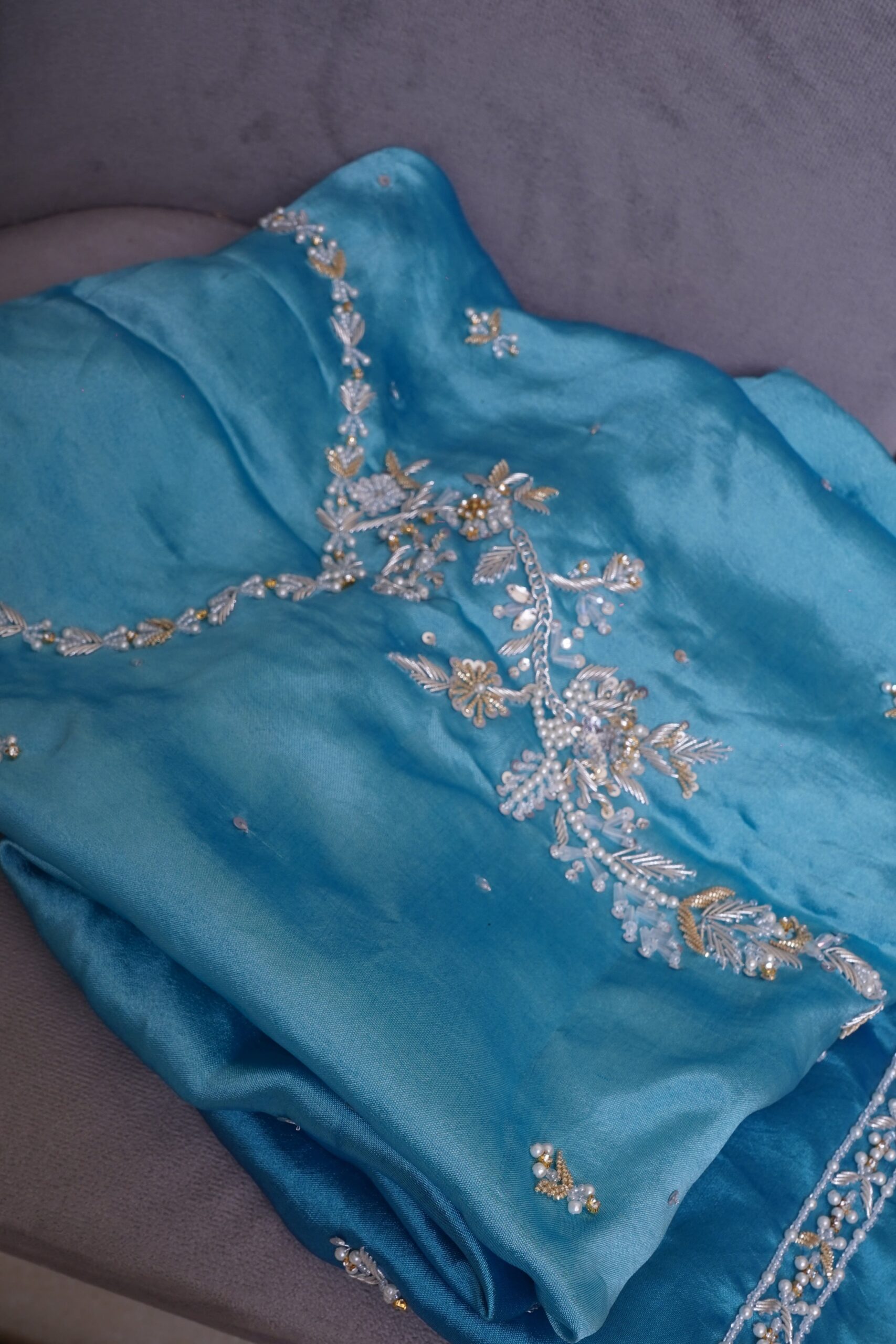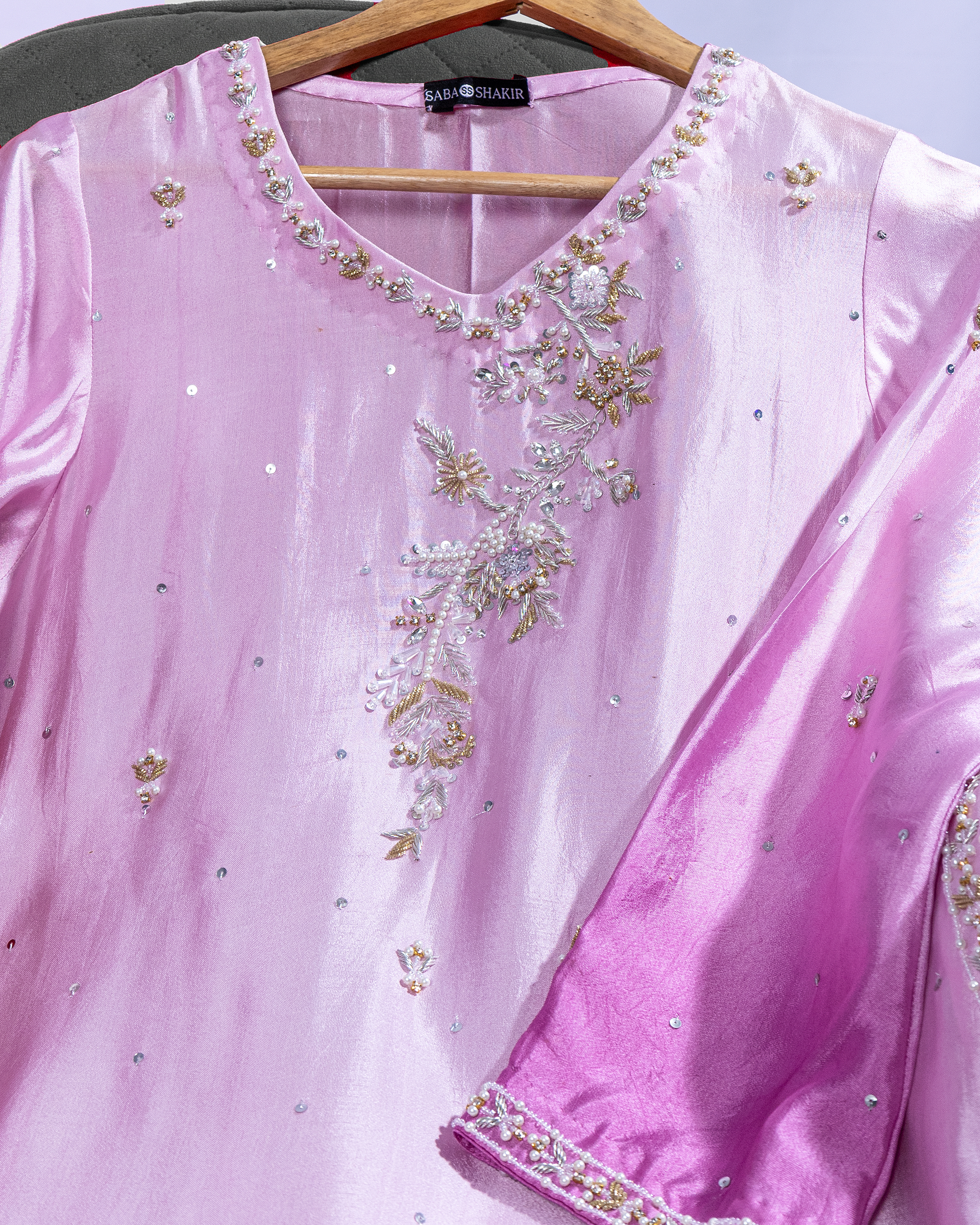 Bahisht is crafted in pure sheesha silk with a soft medium silk dupatta, offered in three exquisite ombré shades—pink, turquoise, and olive. The V-neckline and shoulder-to-daman design are beautifully embellished with silver zardozi, sequins, Swarovski, and delicate zero pearls, adding just the right touch of sparkle. The shaded fabric flows gracefully in color, making this ensemble elegant, versatile, and timeless.