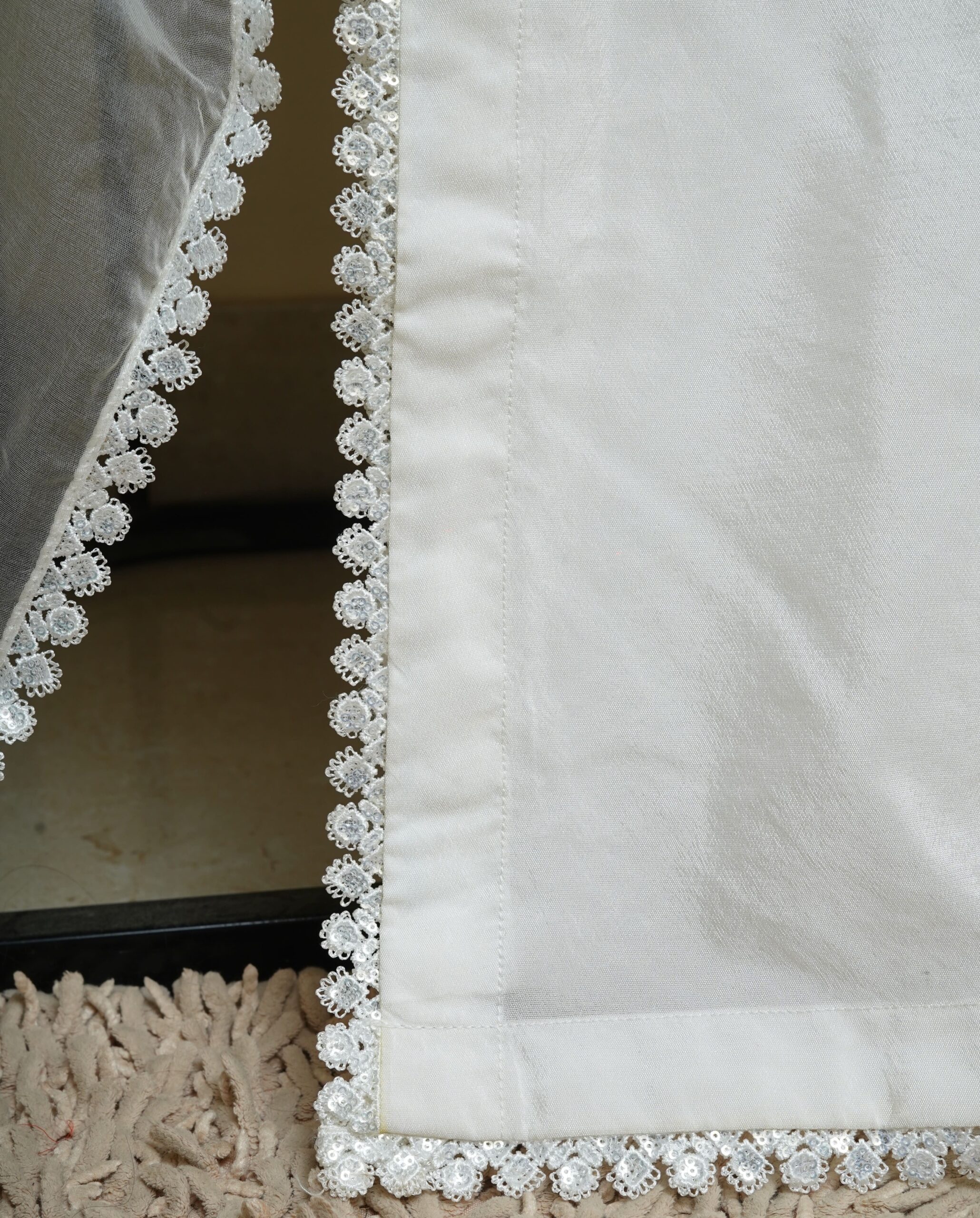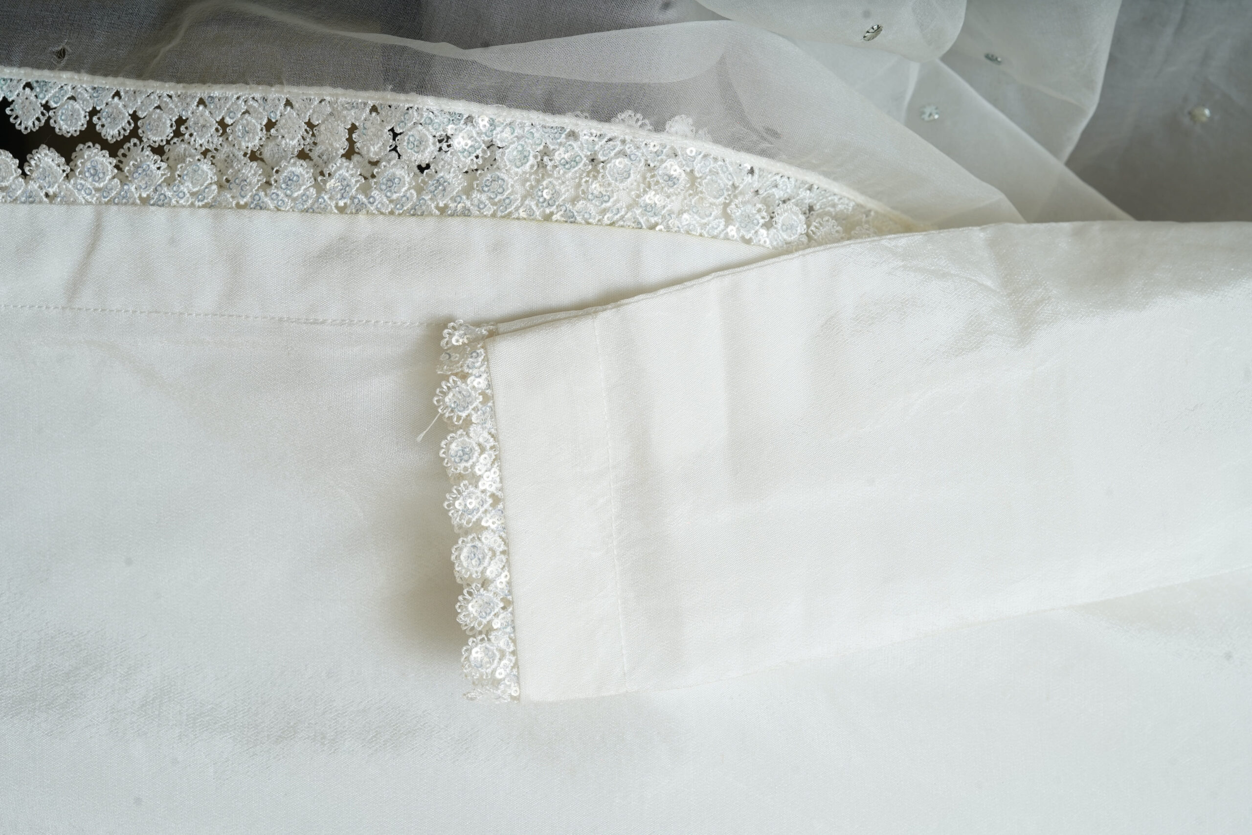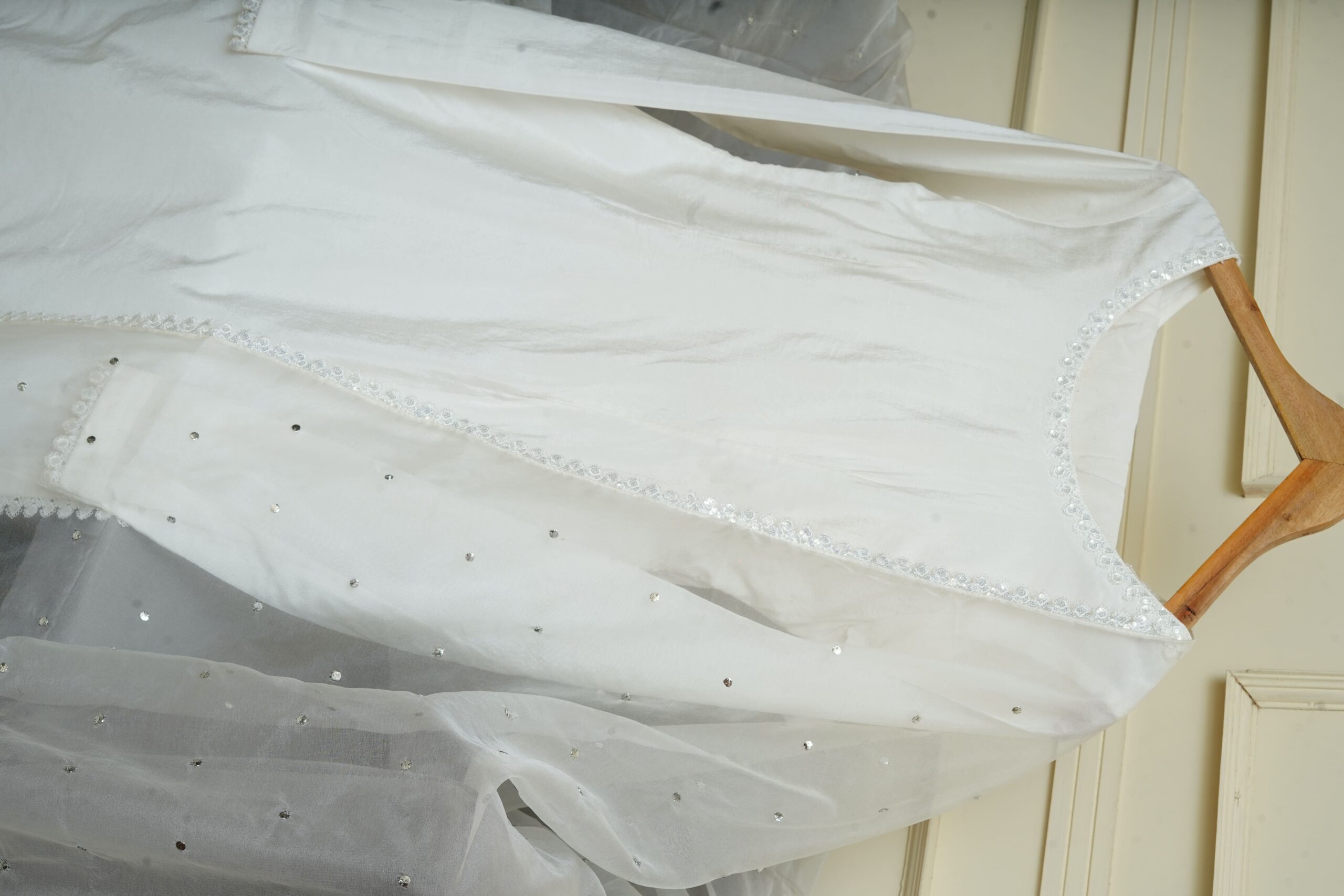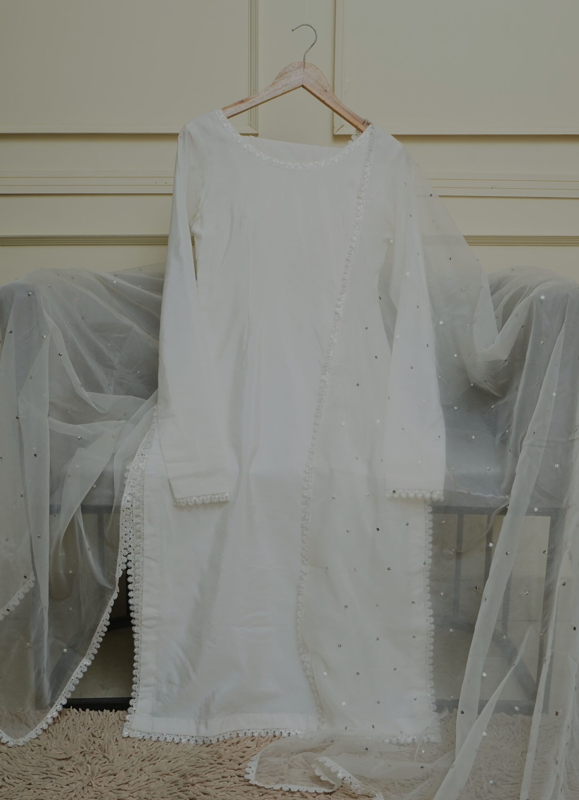 Swan is a graceful 3 piece stitched outfit, crafted in pure sheesha silk with a delicate organza dupatta. The crisp white ensemble features a straight shirt and trouser with a deep boat neckline, keeping the design minimal yet refined. The dupatta is highlighted with subtle Mukesh work, adding a soft shimmer to the otherwise plain dress, making it effortlessly elegant for any occasion.