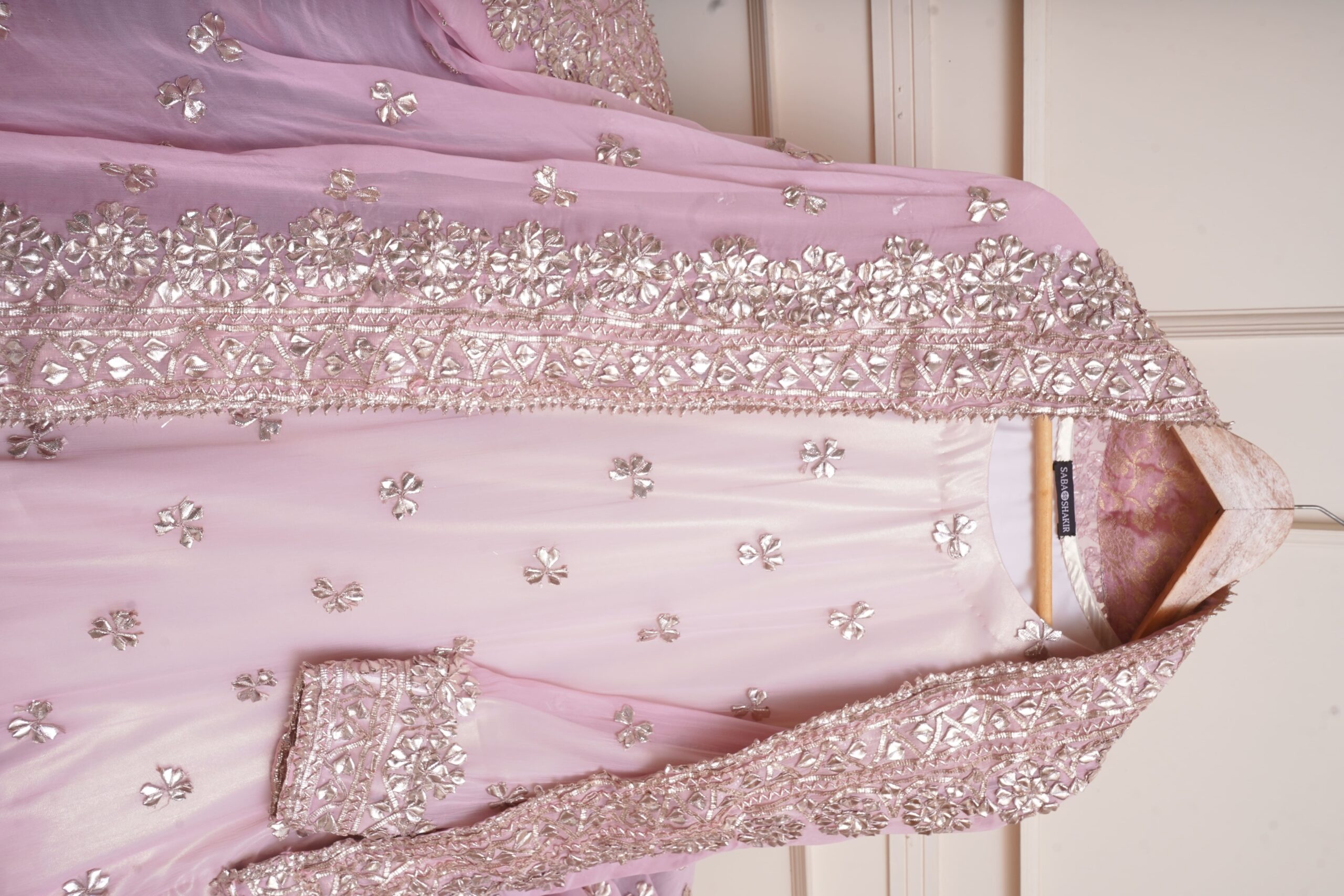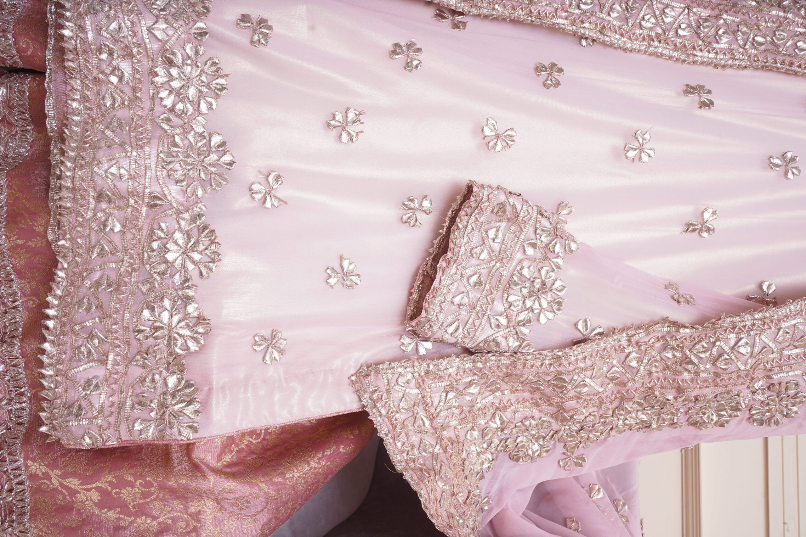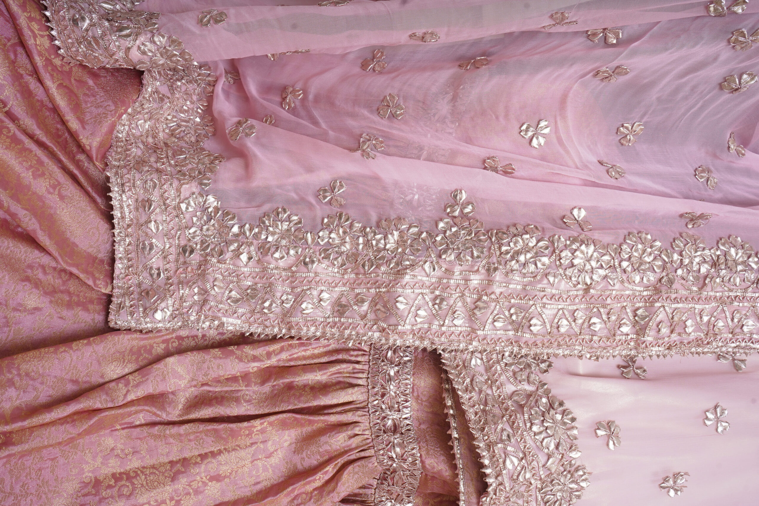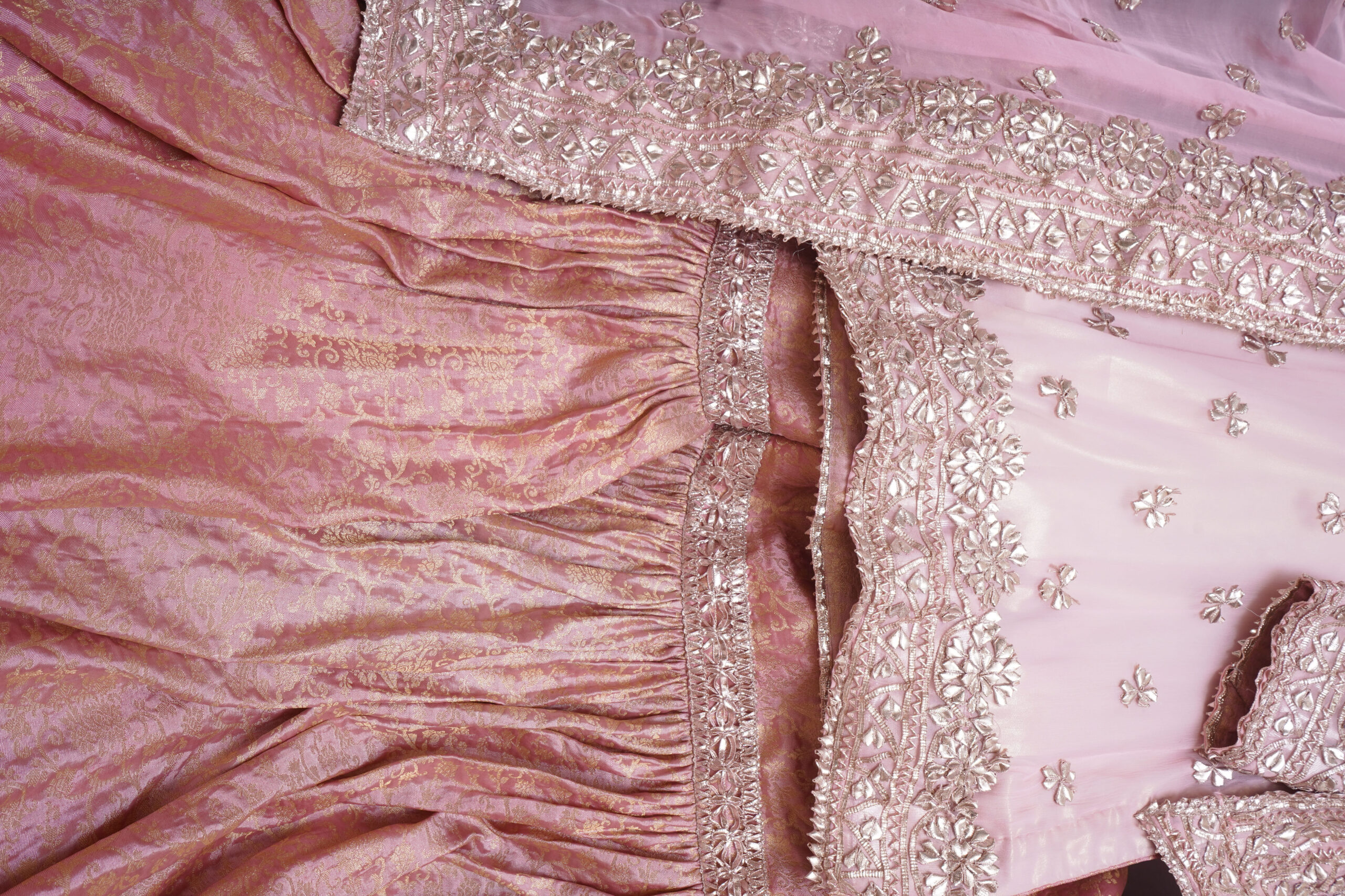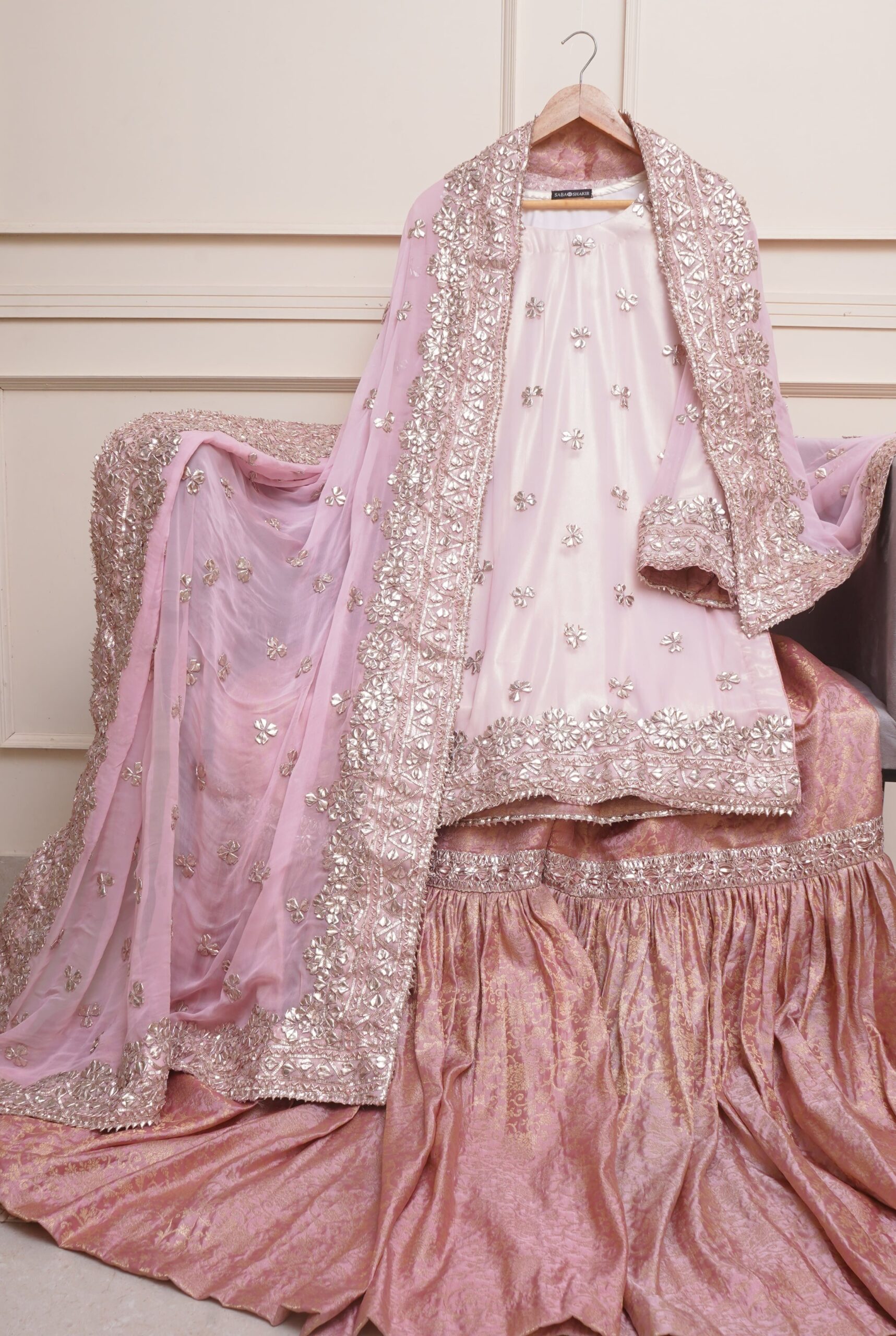 Zari is a regal pink banarsi gharara paired with a bamber chiffon shirt and dupatta, featuring exquisite LCD gota work. The gharara carries a traditional cut with a graceful flare, lined with shimmer silk for a rich finish. Both the shirt and dupatta are adorned with heavy gota embroidery, delicate tassels, and banarsi paltawa finishing, making this ensemble a timeless ode to classical elegance.
