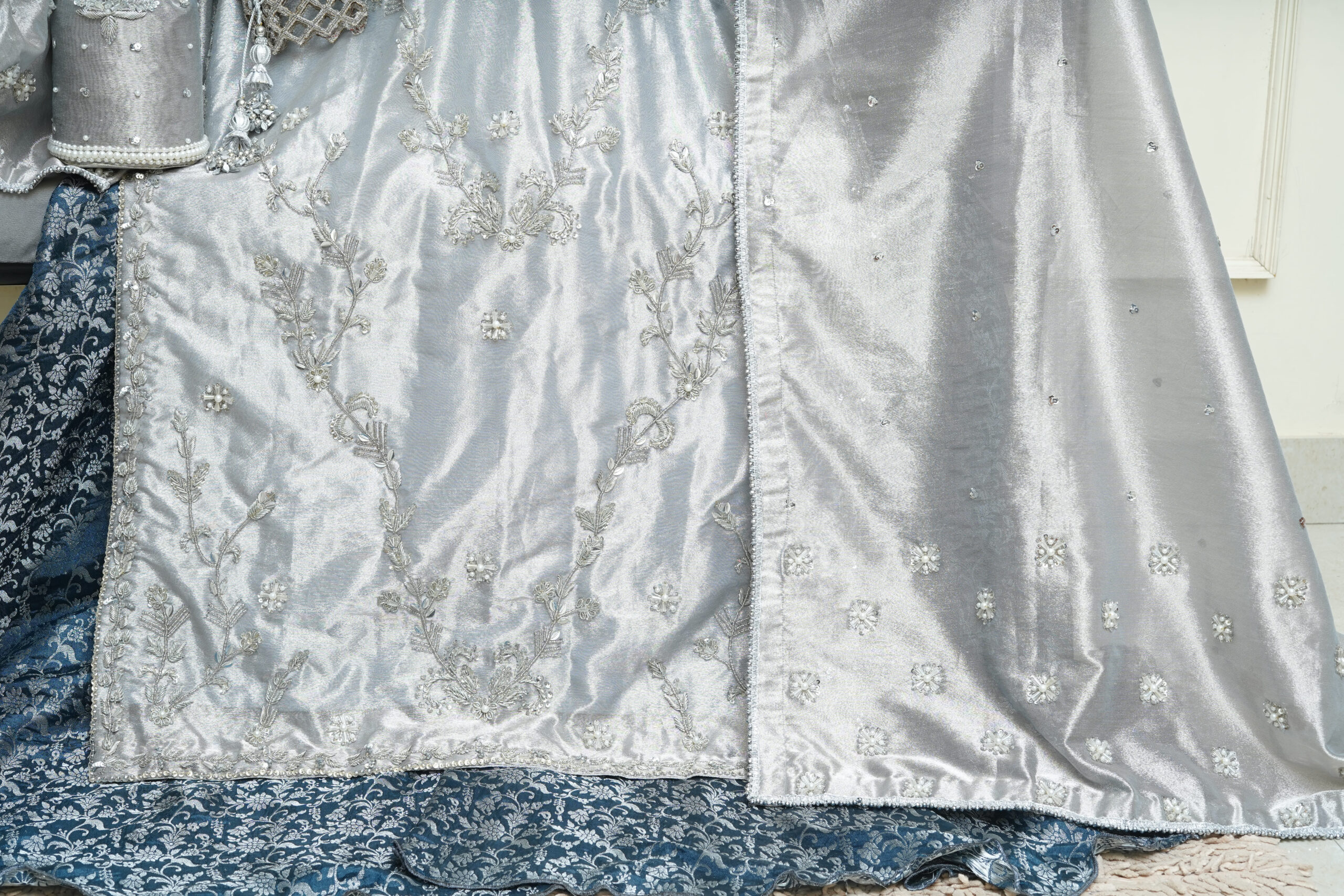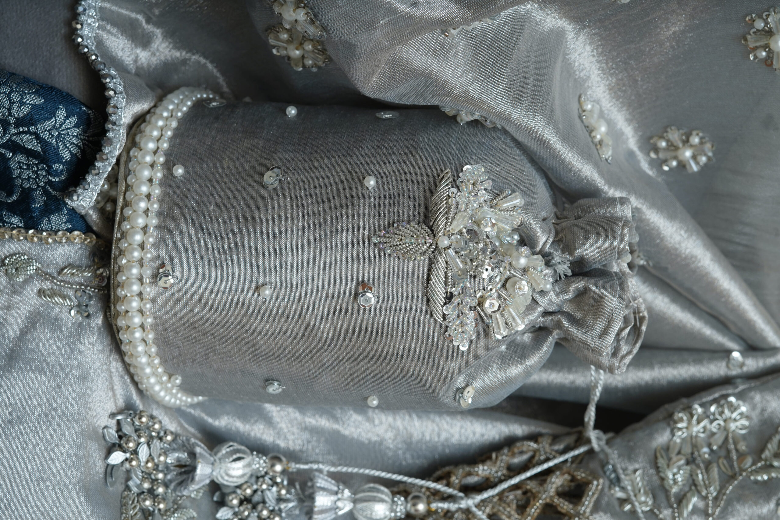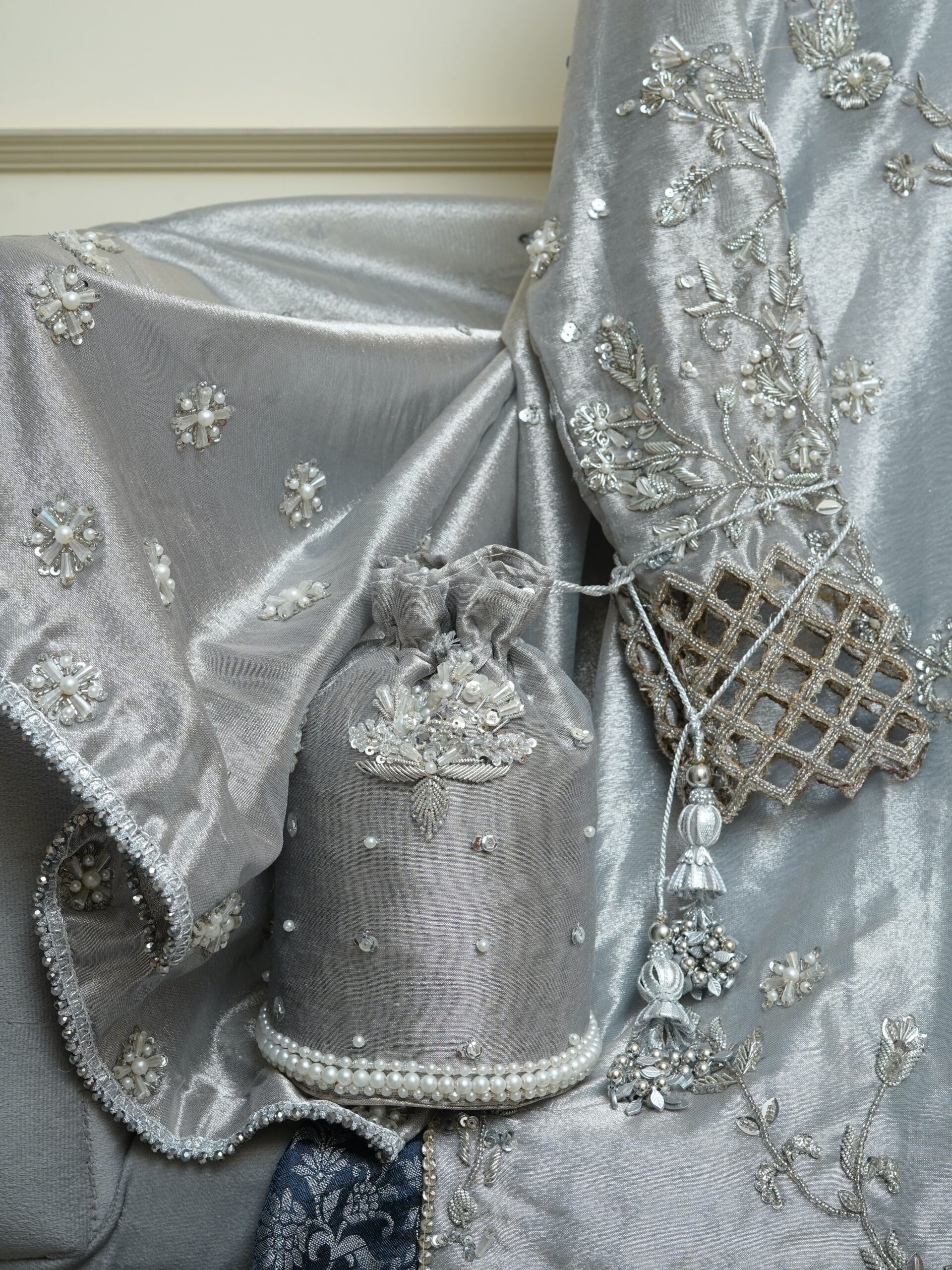 Zarqash is an opulent creation in pure lama tissue with chandi zari, dyed in a subtle tint of blue to create a luminous silver glow. The shirt is heavily embellished with silver-grey zardozi, cutwork on the sleeves, beadwork, sequins, kora-dabka, Swarovski, resham, and nakshi — a masterful blend of artisanal handwork. The dupatta is equally resplendent, adorned with fine-crystal embroidery along the border and finished with silver banarsi paltawa. For versatility, the ensemble is paired with a straight silver banarsi trouser for a formal look, or with flared blue jamawar palazzo pants for a striking bridal statement. A matching embellished potli bag completes the ensemble, making it a timeless vision of silver elegance.
