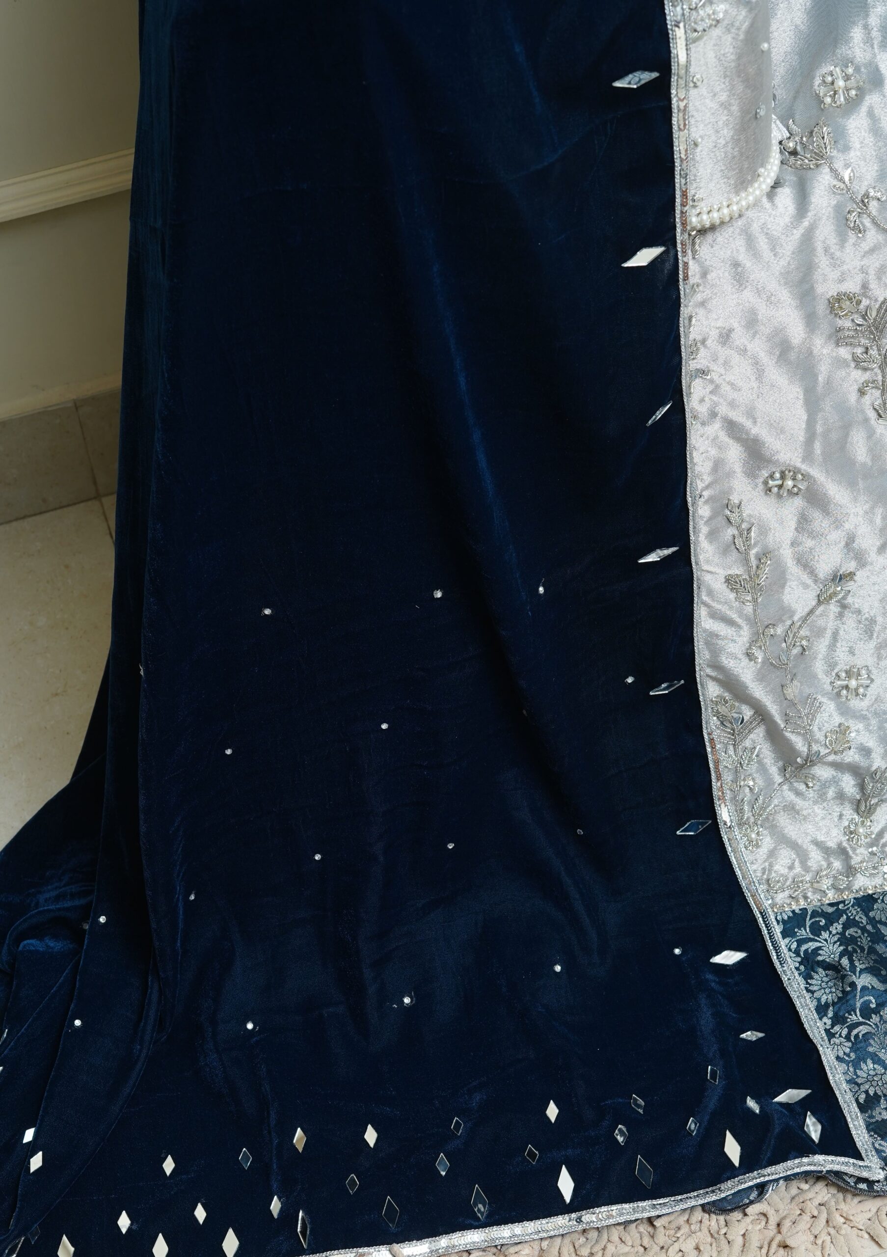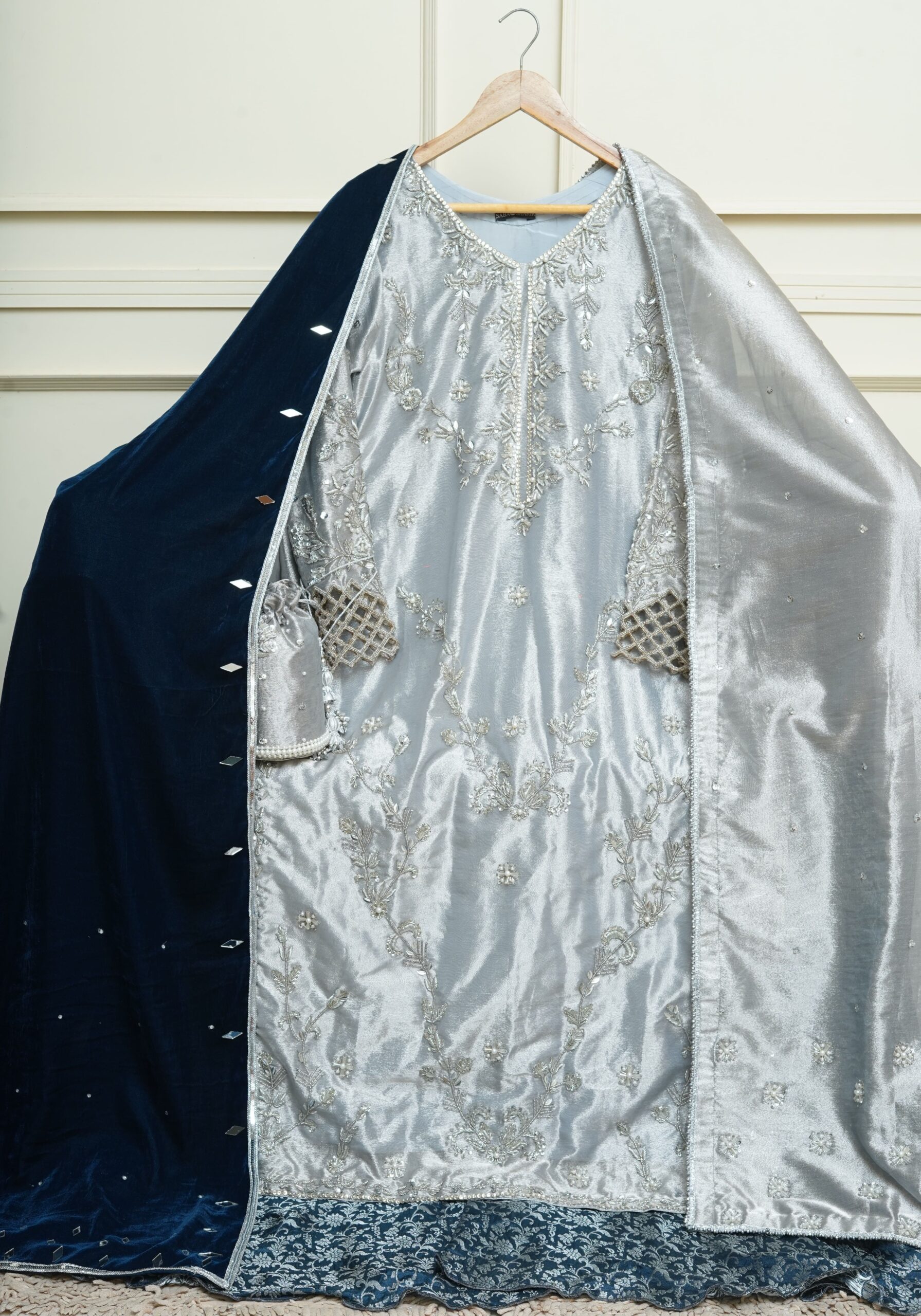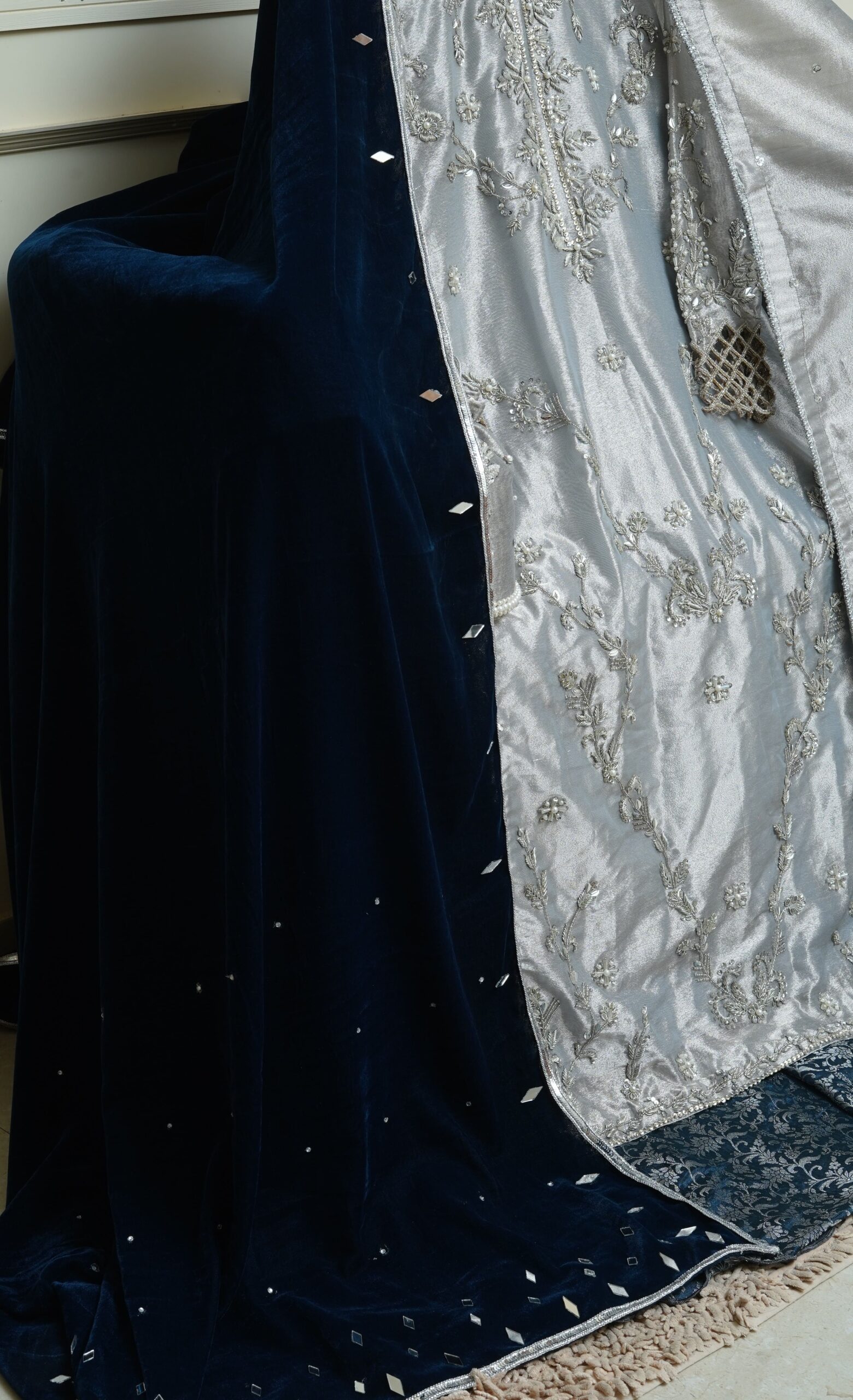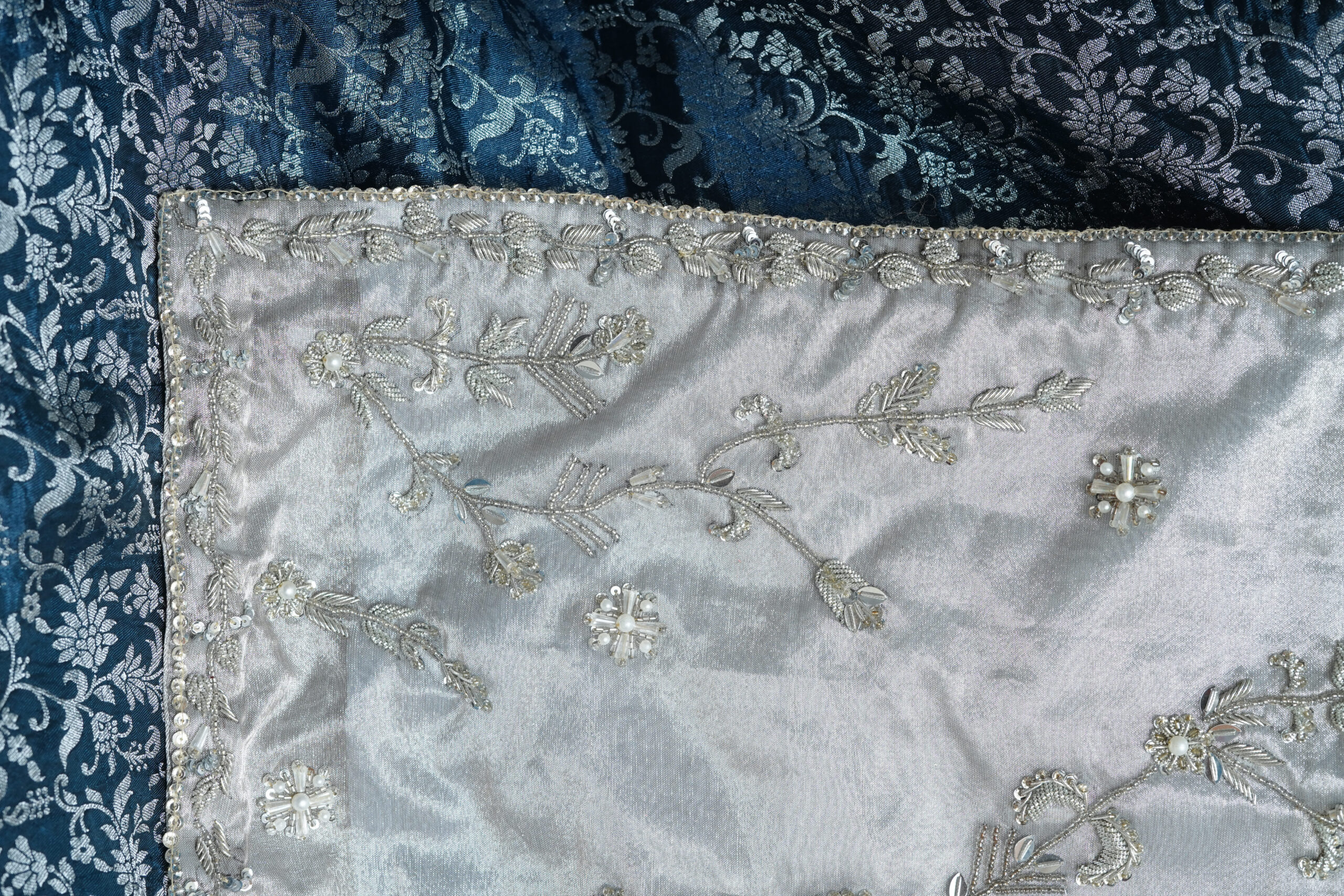 Zarqash is an opulent creation in pure lama tissue with chandi zari, dyed in a subtle tint of blue to create a luminous silver glow. The shirt is heavily embellished with silver-grey zardozi, cutwork on the sleeves, beadwork, sequins, kora-dabka, Swarovski, resham, and nakshi — a masterful blend of artisanal handwork. The dupatta is equally resplendent, adorned with fine-crystal embroidery along the border and finished with silver banarsi paltawa. For versatility, the ensemble is paired with a straight silver banarsi trouser for a formal look, or with flared blue jamawar palazzo pants for a striking bridal statement. A matching embellished potli bag completes the ensemble, making it a timeless vision of silver elegance.
